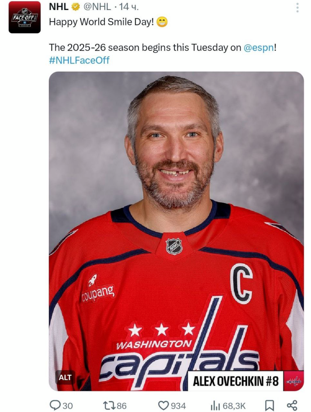 НХЛ отметила Всемирный день улыбки снимком Овечкина