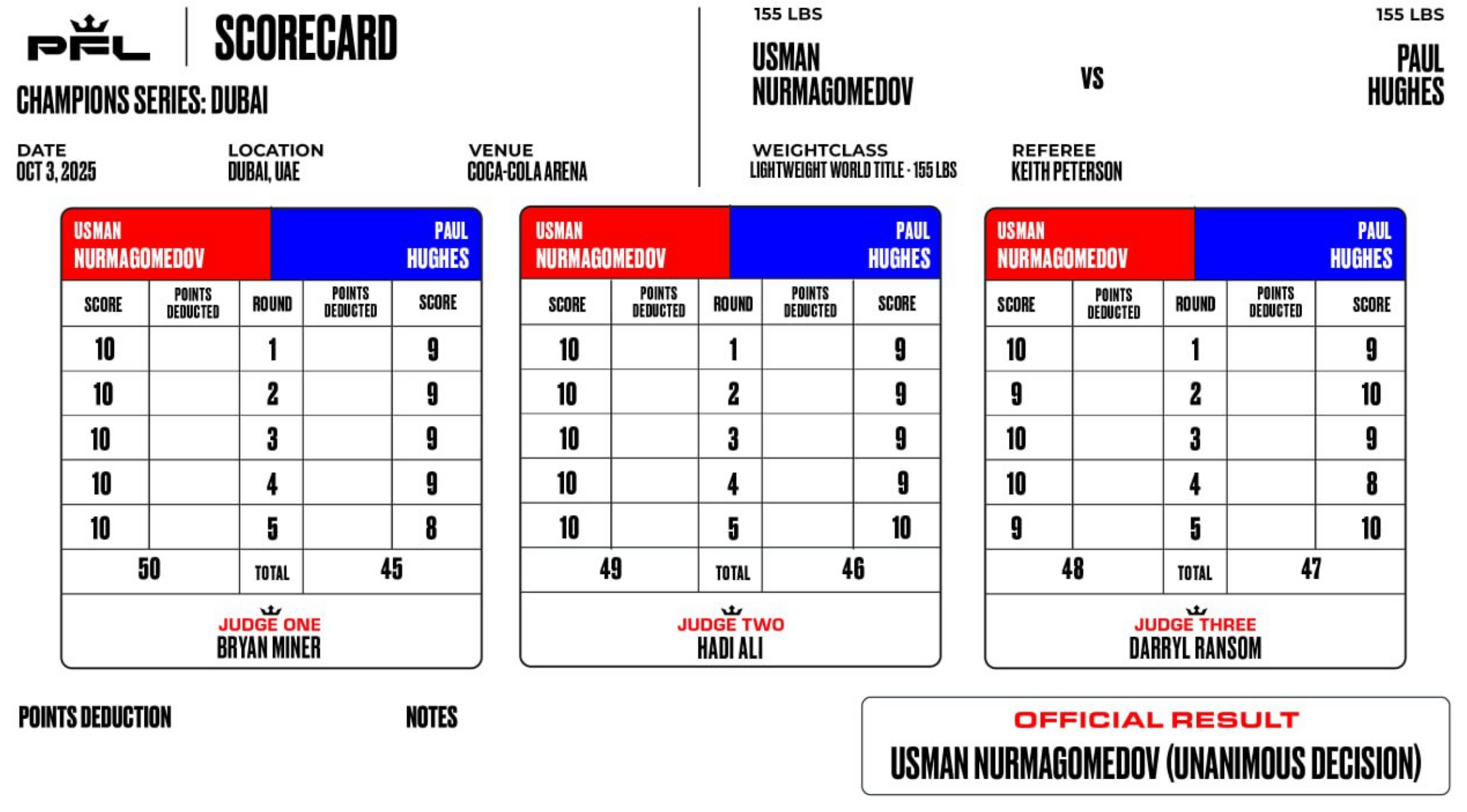 В ночь на 4 октября в Дубае прошёл турнир PFL Road to Dubai Champions Series 3. Главным событием вечера стал поединок за титул чемпиона в лёгком весе, в котором российский боец Усман Нурмагомедов одержал победу над ирландцем Полом Хьюзом единогласным решением судей (50-45, 49-46 и 48-47).