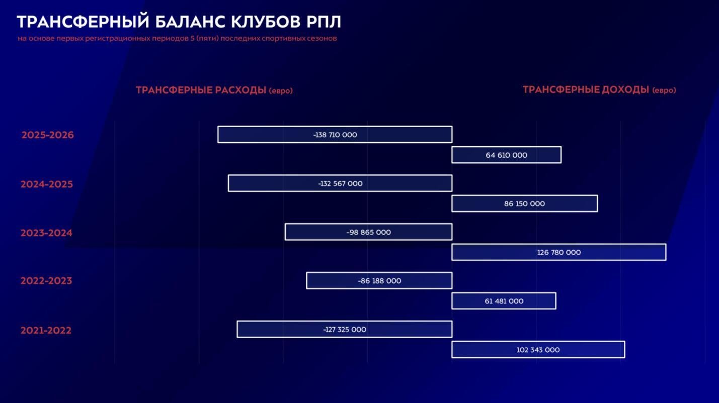 Общие расходы команд на трансферы составили 138,7 млн евро, что на 6,2 млн евро превышает траты летом 2024-го. При этом клубы заработали на переходах игроков 64,6 млн евро. Трансферные доходы по сравнению с 2024 годом упали почти на 22 млн.