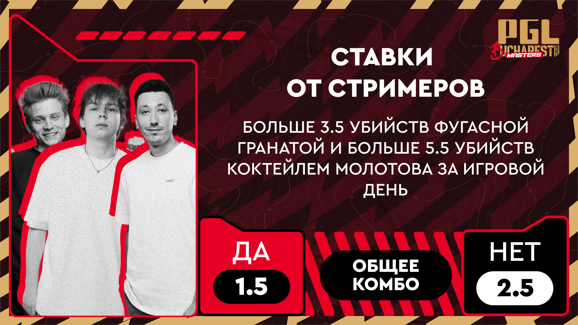 Каждый из стримеров придумал свою ставку, например: «StRoGo: будет убийство с ножа» или «PCH3LK1N: Будет сделан эйс». Кроме того, для клиентов первого букмекера будет открыта специальная общая комбо-ставка, предложенная всеми стримерами. Для ее расчета за одну карту игрового дня должно произойти убийство с использованием коктейля Молотова и убийство с применением осколочной гранаты.