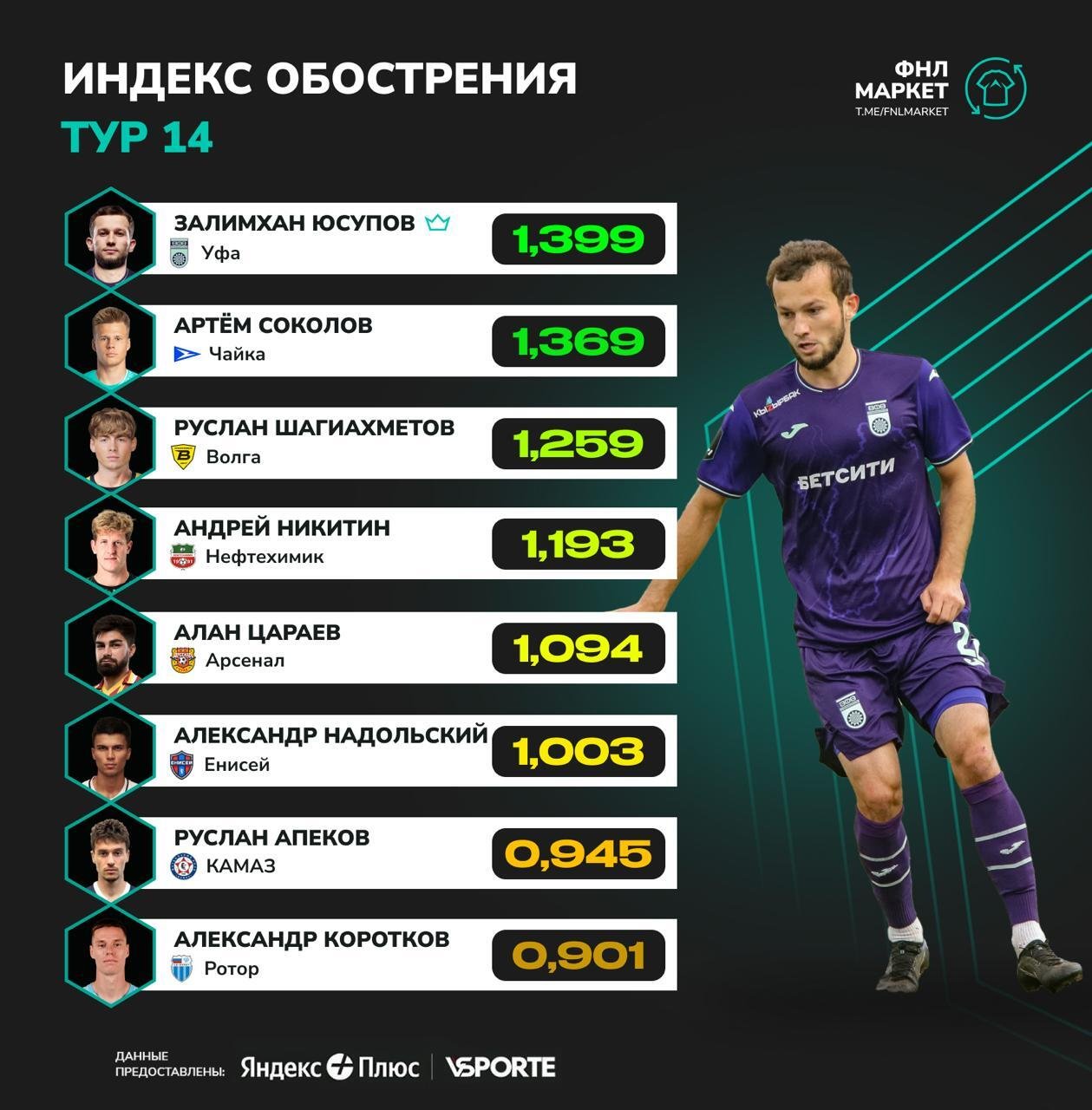 Футбольная национальная лига (ФНЛ) опубликовала рейтинг игроков Лиги PARI по индексу обострения после 14-го тура.