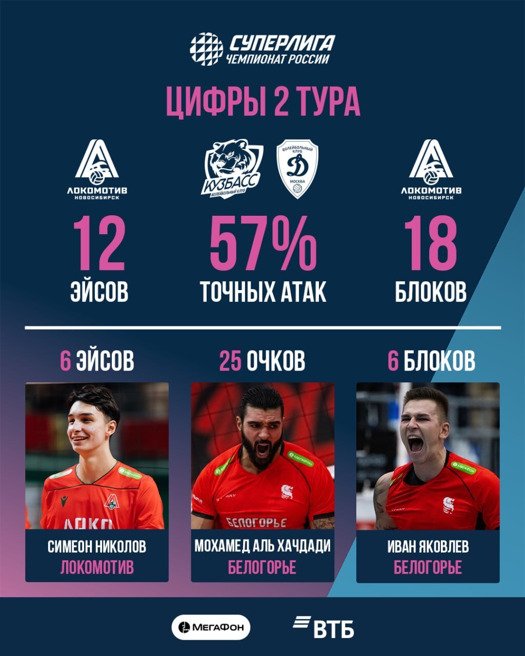 «Локомотив» стал лучшей командой по суммарному числу успешных блоков (18). Первое место по результативным подачам в минувшем туре также занял «Локо» — 12. Игроки «Кузбасса» и московского «Динамо» показали лучший результат по проценту точных атак (57%).