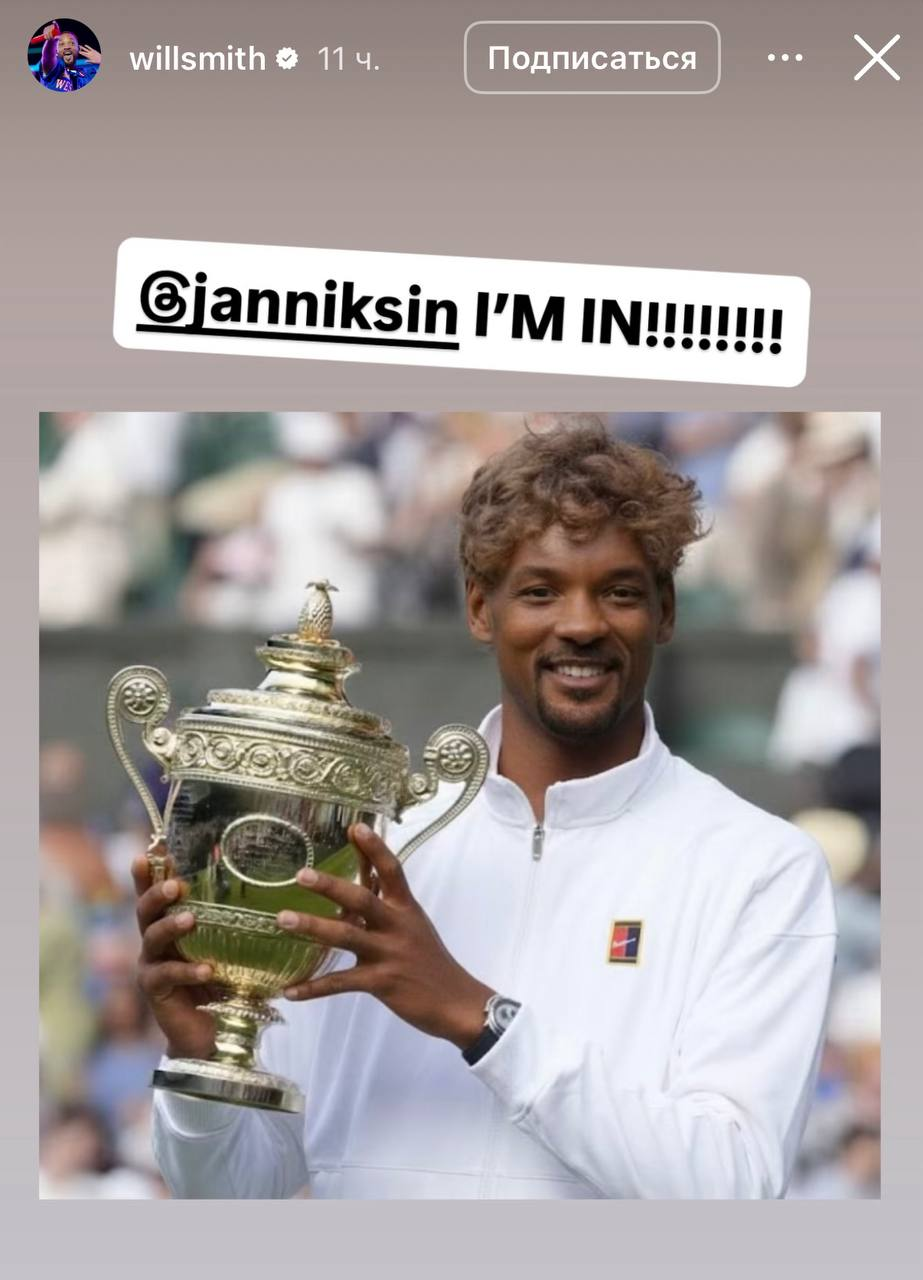 Известный голливудский актёр Уилл Смит отреагировал на слова второй ракетки Янника Синнера о себе. Ранее итальянский спортсмен заявил, что хотел бы, чтобы в фильме о нём когда-нибудь снялся Смит.
