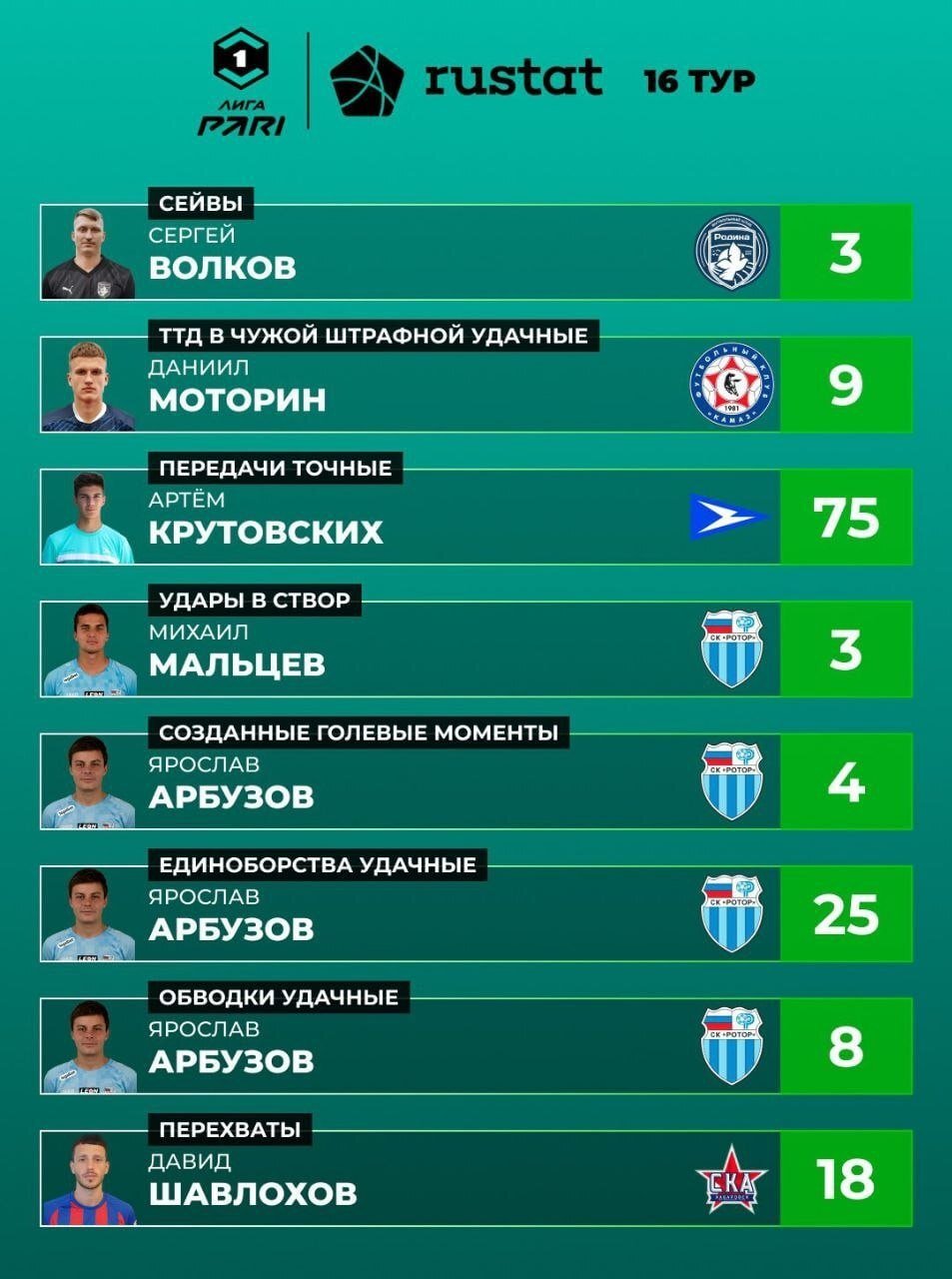 Волгоградский «Ротор» показал лучший результат в 16-м туре сразу по нескольким статистическим показателям.