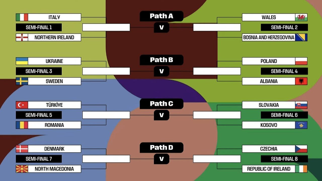 Сборная Италии в полуфинале встретится с Северной Ирландией. Победитель этой пары сыграет либо с Уэльсом, либо с Боснией и Герцеговиной. Соперником Украины стала Швеция, которая попала в стыки благодаря победе в группе С1 Лиги наций УЕФА. В финале победитель этой пары сыграет с Польшей или Албанией.