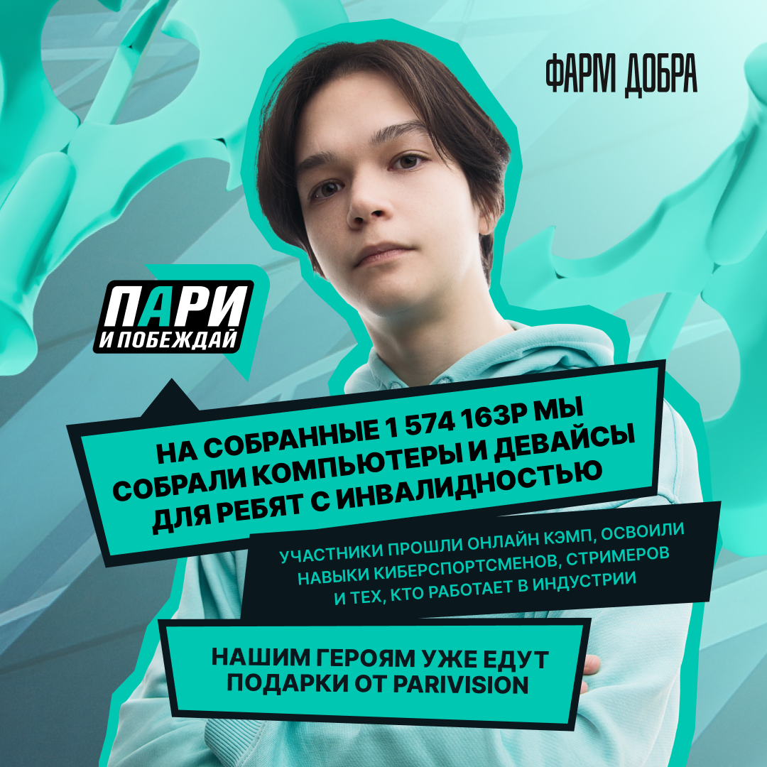 Благотворительный фонд «Пари и побеждай» подвел итоги социального проекта «Фарм добра», проведенного совместно с киберспортивным клубом PARIVISION. В рамках инициативы для детей с инвалидностью была закуплена современная компьютерная техника, а также организован киберспортивный кемп.
