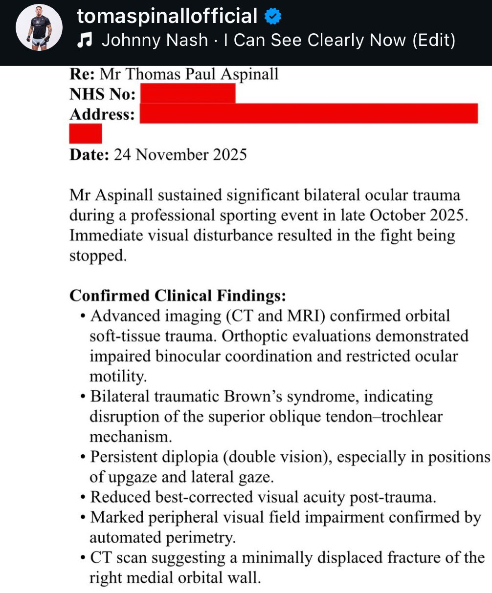 Чемпион UFC в тяжёлом весе британец Том Аспиналл поделился заключением врачей о своей травме после тычков в глаза от француза Сирила Гана.