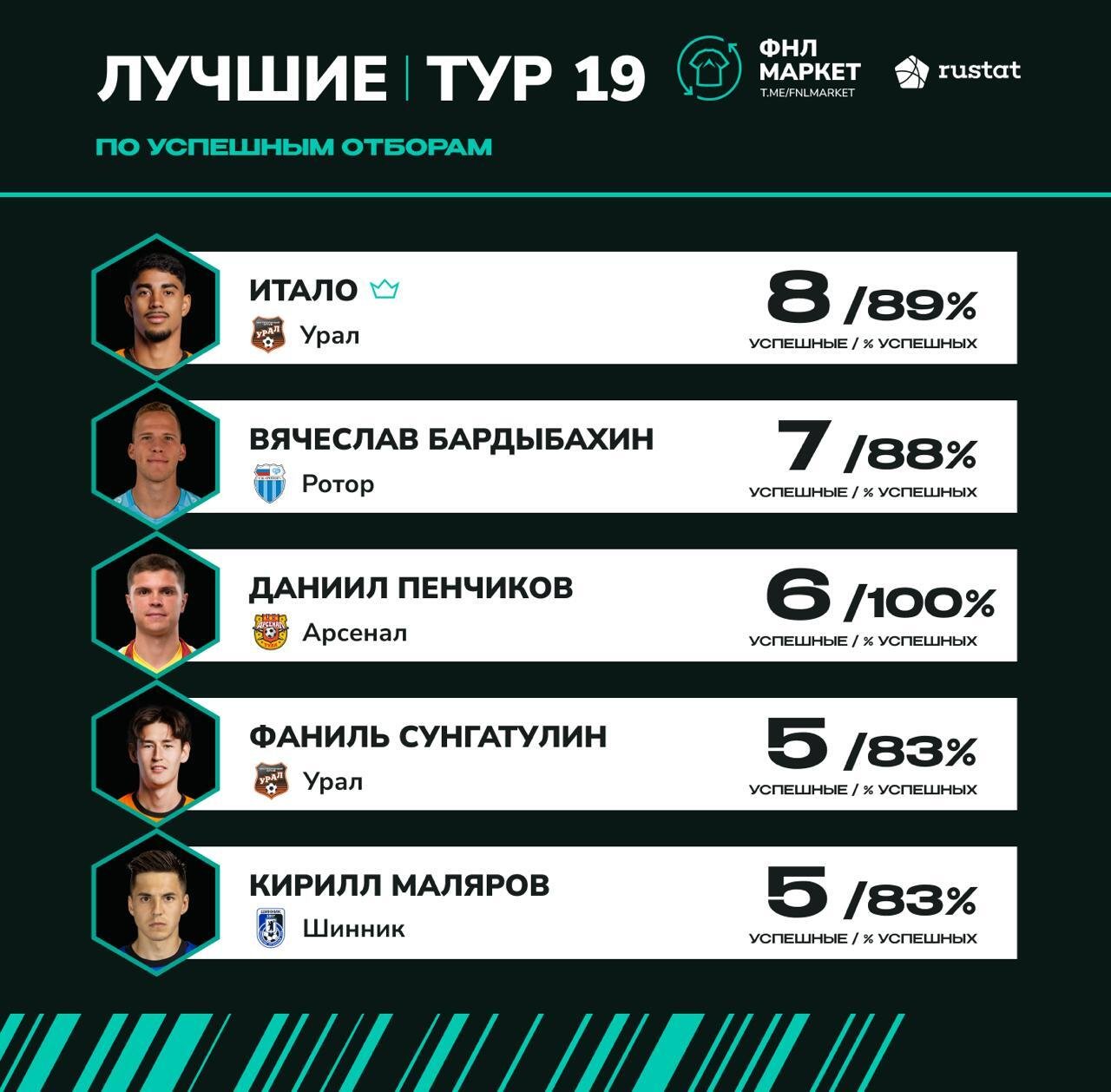 23-летний центрбек в матче с «Торпедо» семь раз отобрал мяч у соперников, показав эффективность в 88%. Бардыбахин занял второе место по этому показателю, уступив только бразильскому защитнику «Урала» Итало.