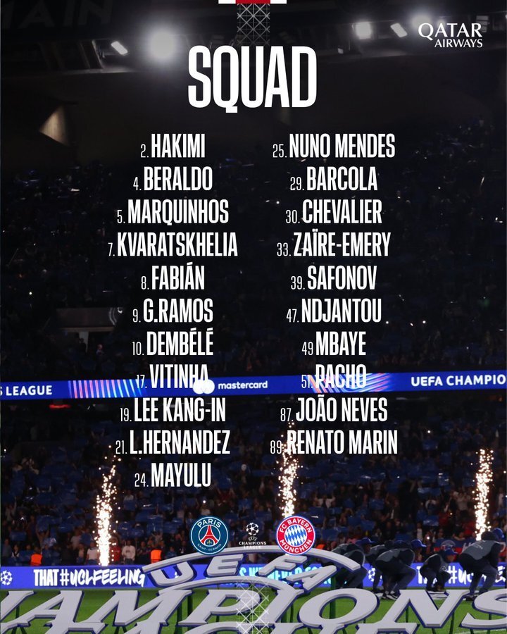 В состав парижан на предстоящую игру с мюнхенцами также вошли российский вратарь Матвей Сафонов и грузинский нападающий Хвича Кварацхелия. Вингер Дезире Дуэ пропустит встречу из-за повреждения бедра, полученного 29 октября в матче Лиги 1 с «Лорьяном» (1:1).