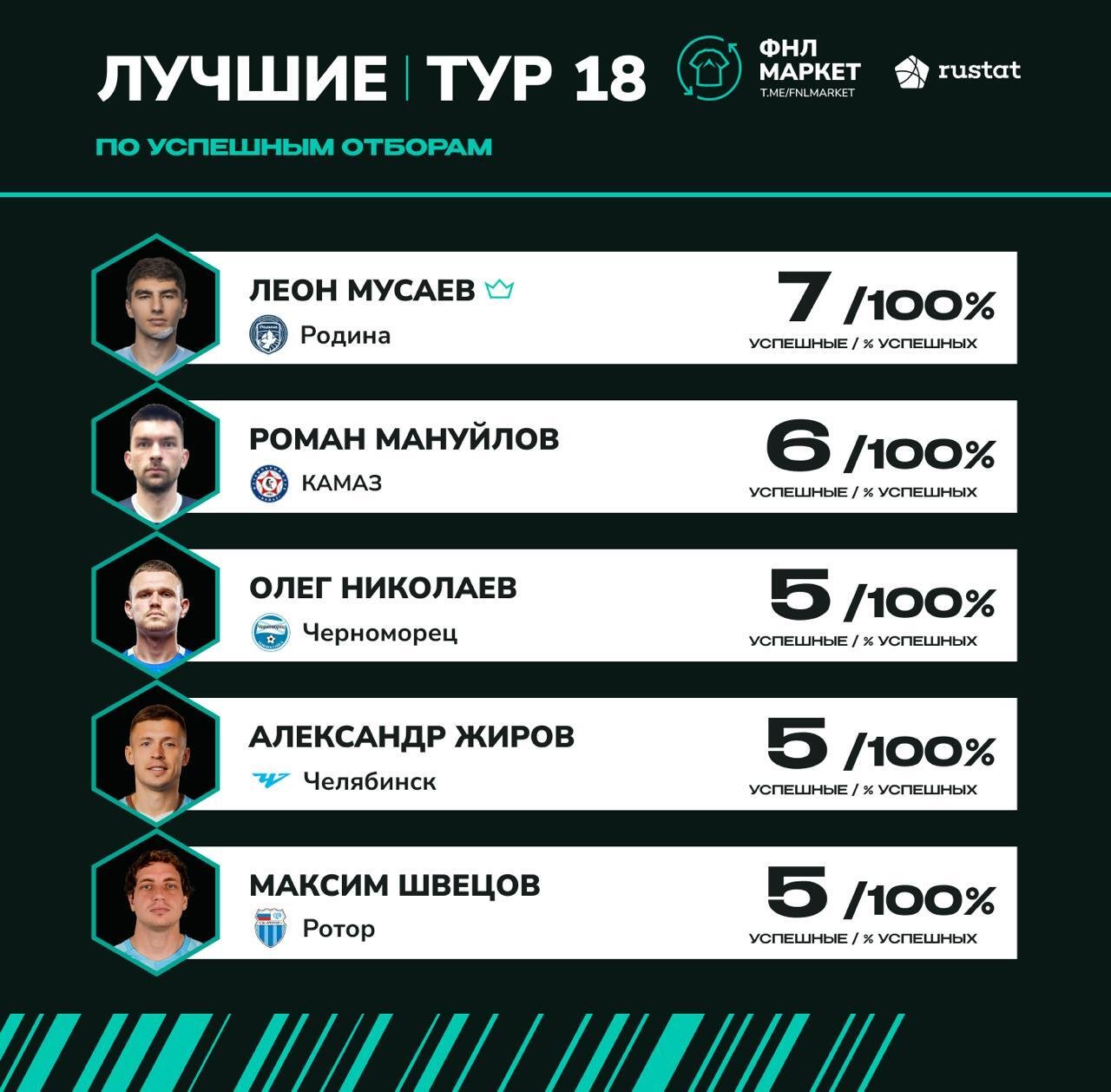 Лидером по этому показателю стал футболист московской «Родины» Леон Мусаев — семь отборов.
