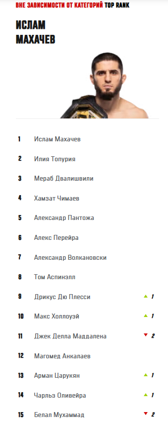 Царукян в топ P4P обошёл бразильца Чарльза Оливейру и американца Белала Мухаммада. Две позиции в списке потерял Джек Делла Маддалена (11), пропустив вверх Макса Холлоуэя (10) и Дрикуса Дю Плесси (9). Лидером рейтинга остался российский чемпион в полусреднем весе Ислам Махачев.