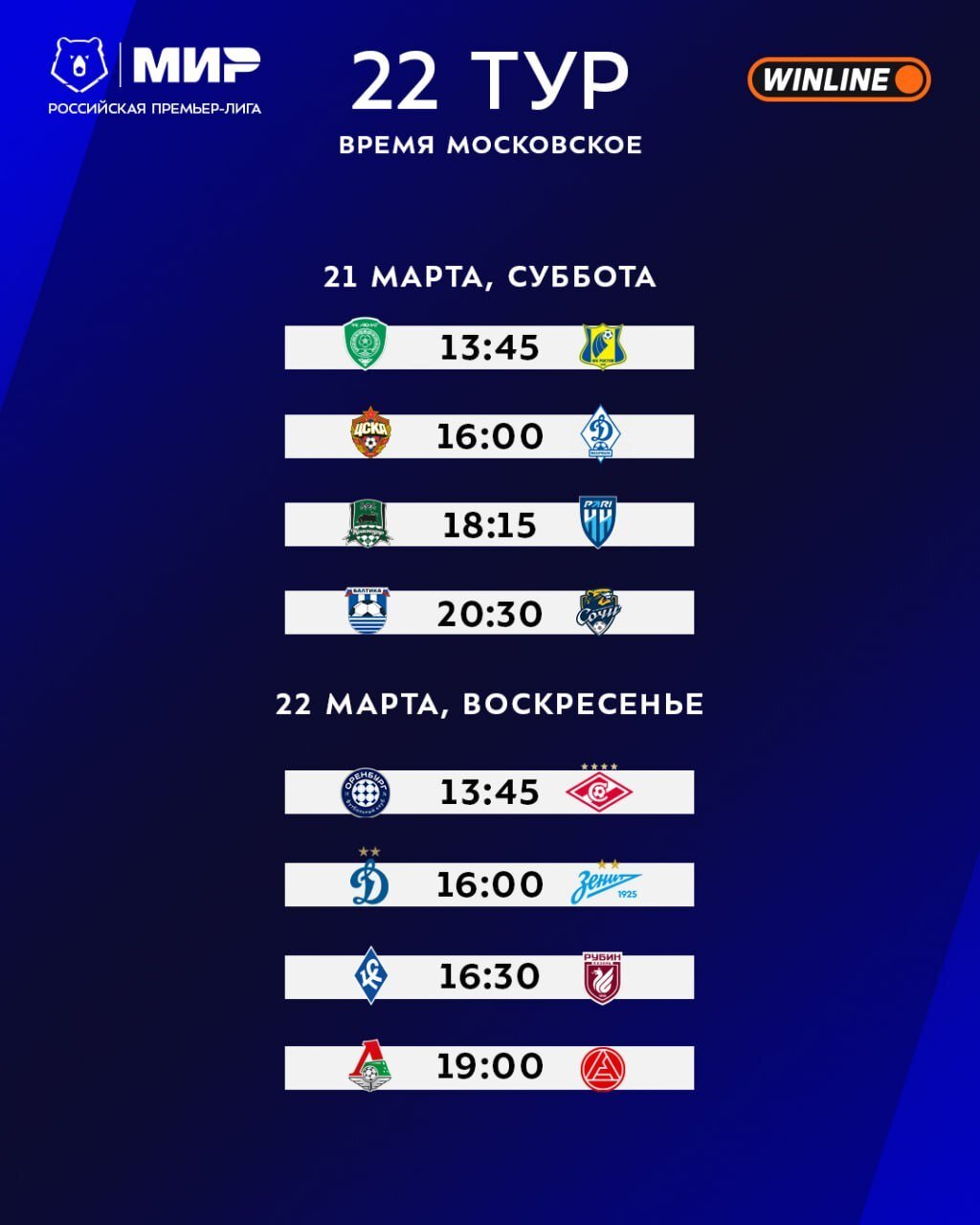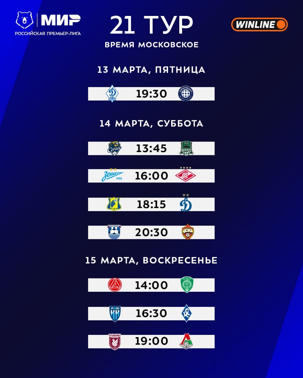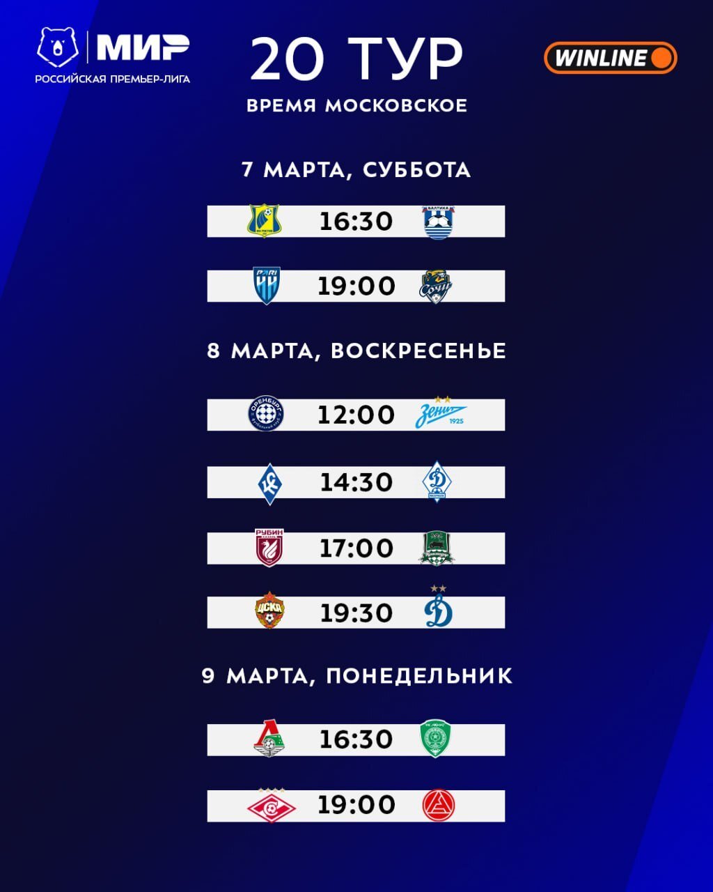 В 20-м туре между собой сыграют ЦСКА и московское «Динамо», матч состоится 8 марта. 14 марта в рамках 21-го тура пройдут игры «Зенит» — «Спартак», «Ростов» — «Динамо» и «Балтика» — ЦСКА. А в 22-м туре «Динамо» примет на своём поле «Зенит» 22 марта.
