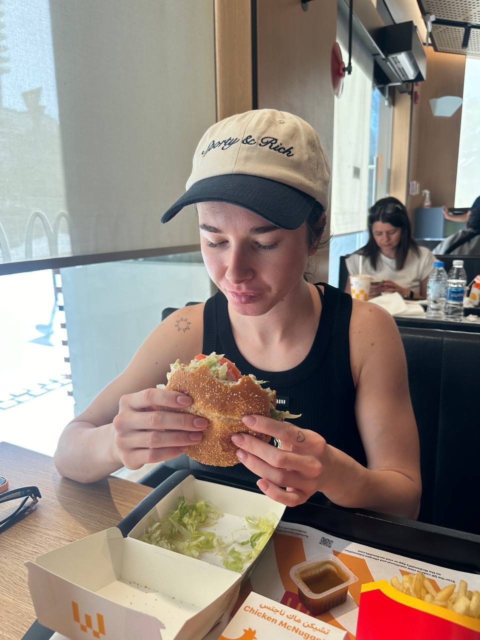 Волков выложил фотографию Непряевой, на которой она сидит с бургером в руках.