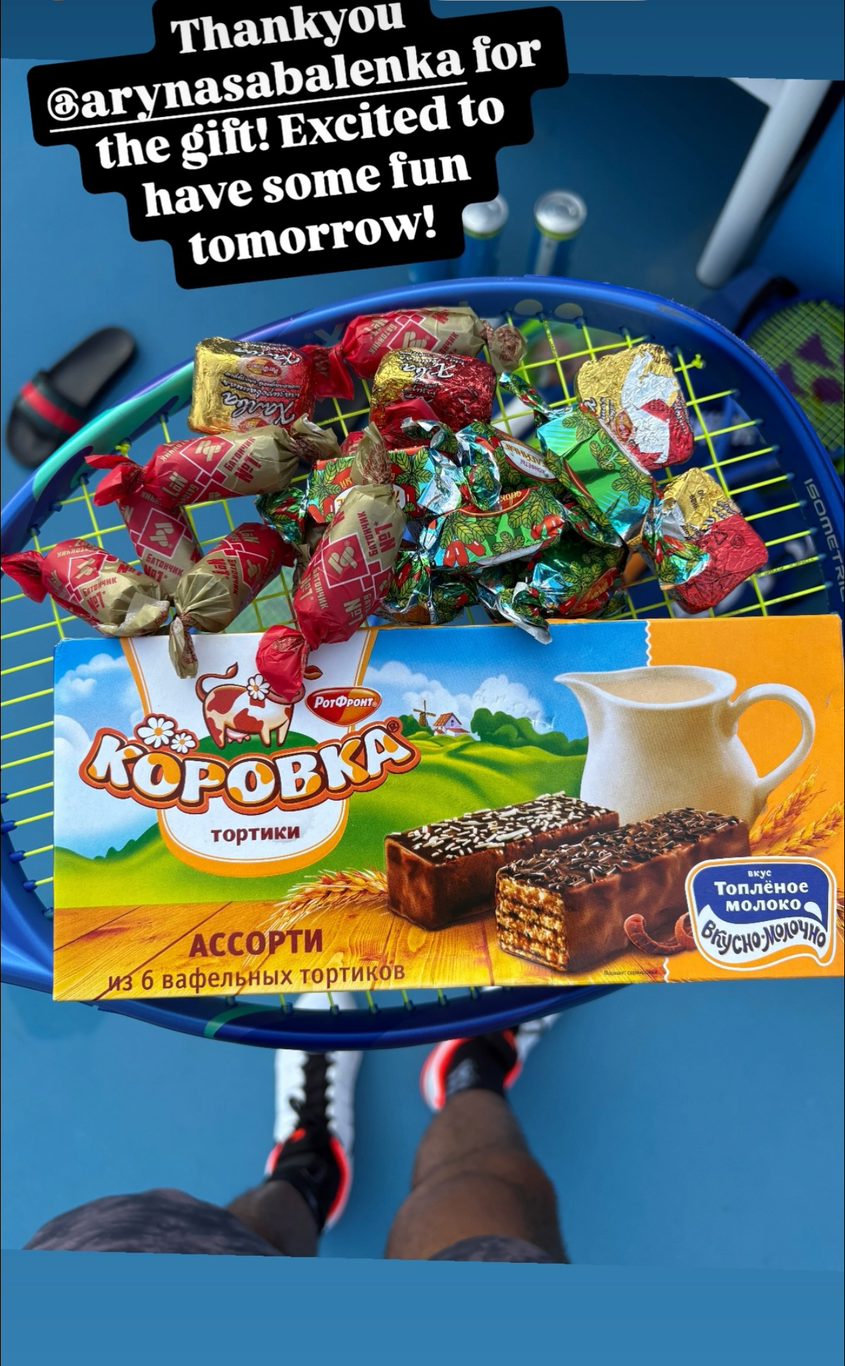 Соболенко подарила Кирьосу российские сладости перед «Битвой полов»: фото