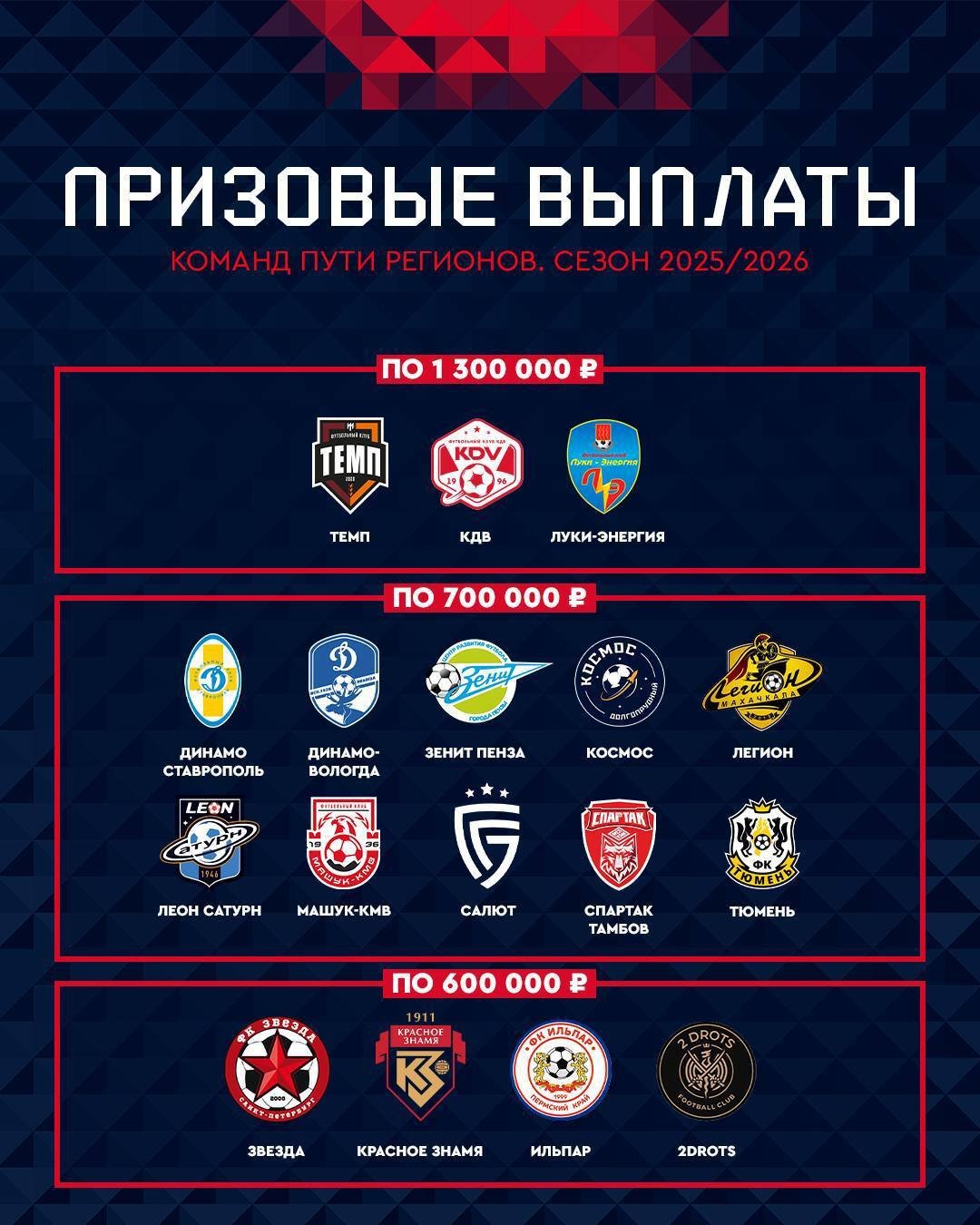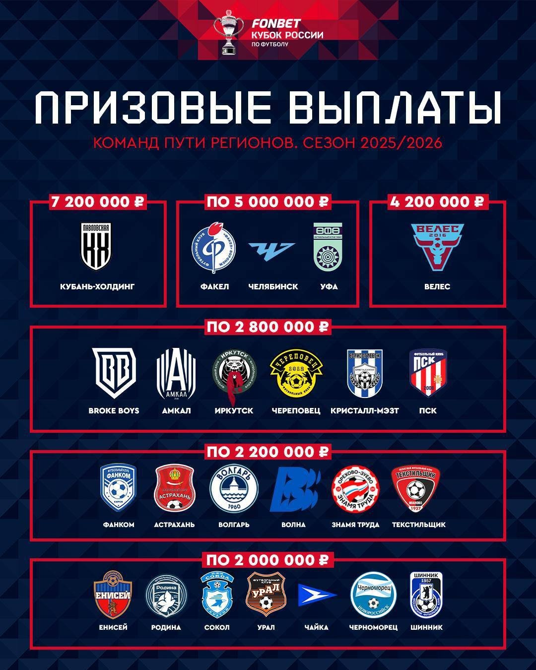 Российский футбольный союз (РФС) раскрыл, сколько денег заработали клубы, принявшие участие в матчах Пути регионов Фонбет Кубка России в первой части сезона-2025/26. 45 команд распределили между собой 136,58 млн рублей призовых за достижение спортивных результатов и исполнение коммерческих и медийных обязательств.