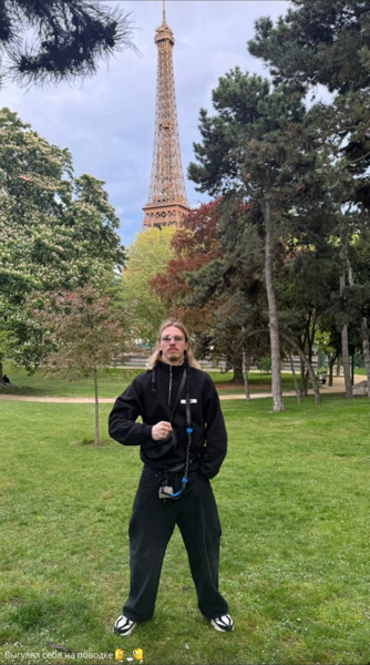 26-летний футболист сфотографировался на фоне Эйфелевой башни в спортивном костюме с собачьим поводком.