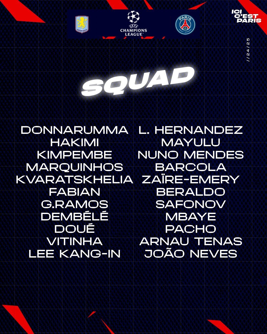«Пари Сен-Жермен» опубликовал заявку на ответный четвертьфинальный матч Лиги чемпионов с «Астон Виллой».