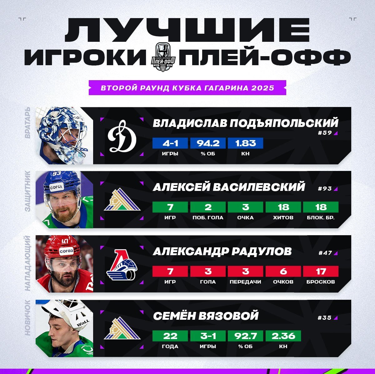 Континентальная хоккейная лига (КХЛ) на официальном сайте представила лучших игроков второго раунда Кубка Гагарина-2025. Ими стали: