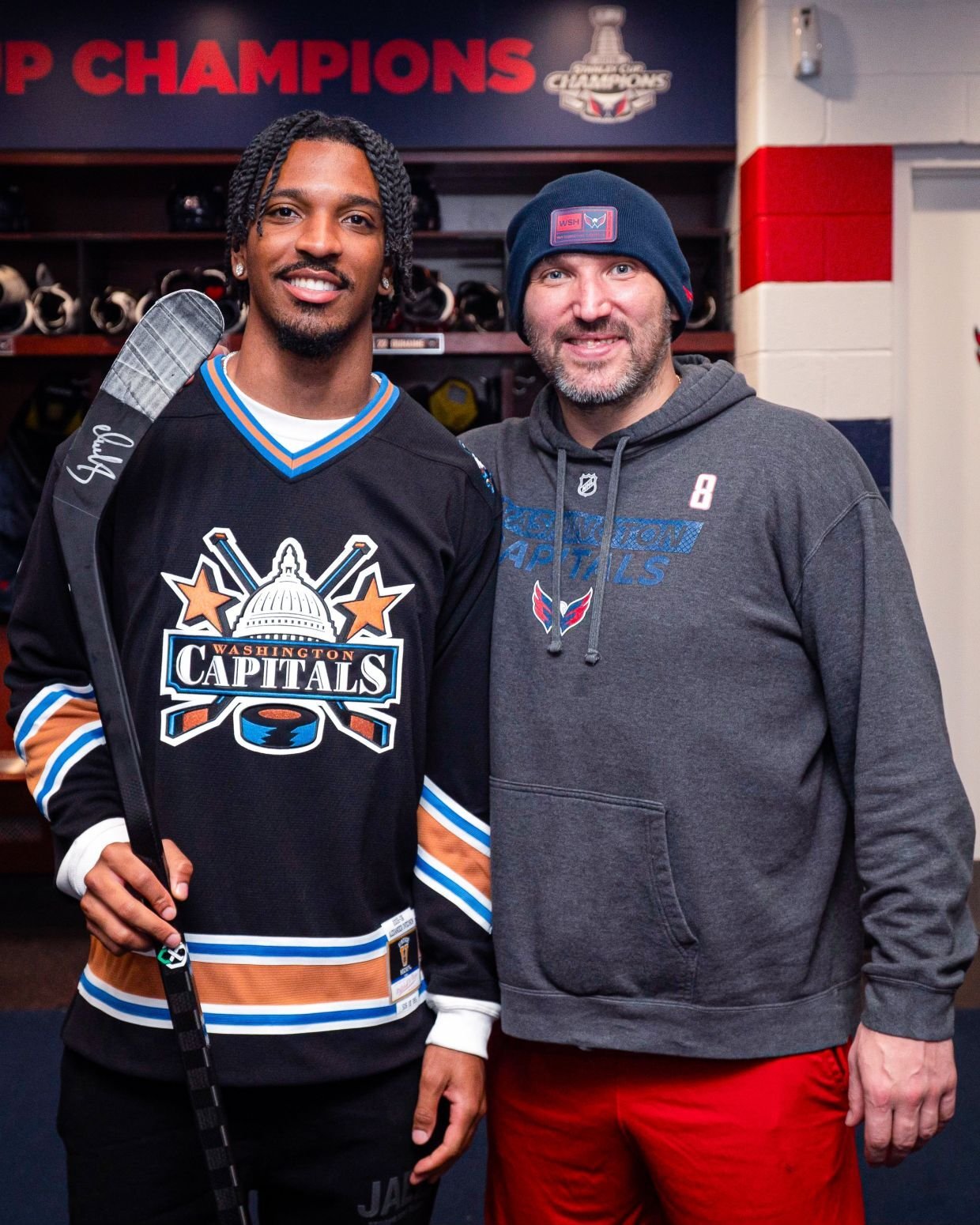 Российский нападающий «Вашингтон Кэпиталс» Александр Овечкин после победы над «Монреалем» (3:1) во втором матче первого раунда Кубка Стэнли-2025 подписал и подарил свою клюшку игроку клубу Национальной футбольной лиги (НФЛ) «Вашингтон Коммандерс» Джейдену Дэниелсу.