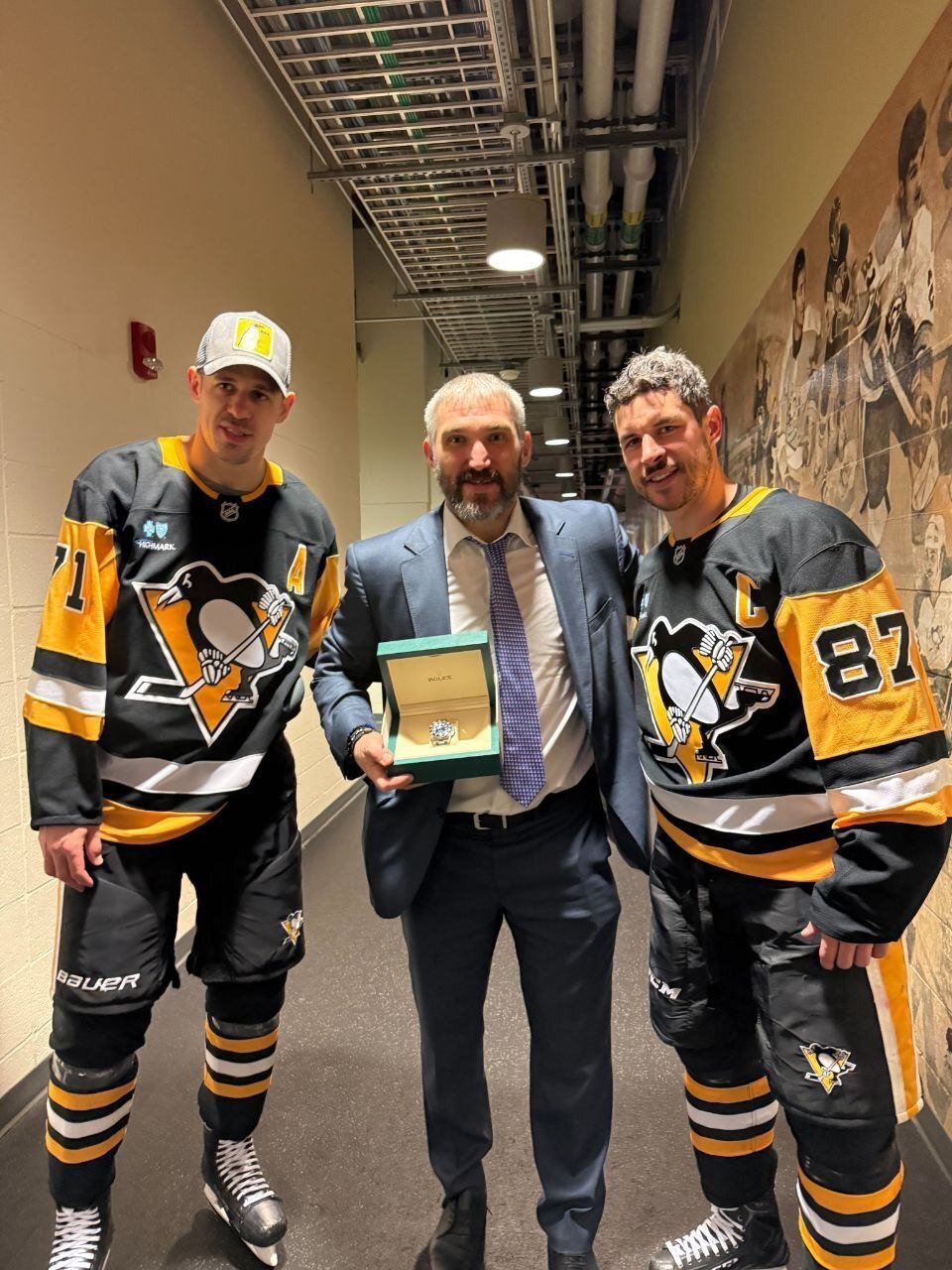 Нападающие «Питтсбург Пингвинс» Евгений Малкин и Сидни Кросби подарили премиальные часы российскому капитану «Вашингтон Кэпиталс» Александру Овечкину в честь его снайперского рекорда в НХЛ.