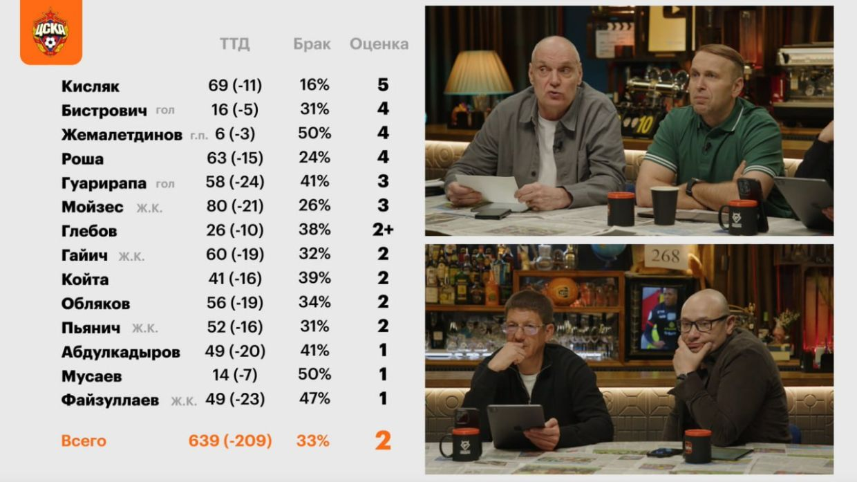 Суммарная оценка игроков ЦСКА, в свою очередь, составила «два». Итоговое количество ТТД армейцев, по мнению эксперта, составило 639 (-209). Брак равнялся 33%.