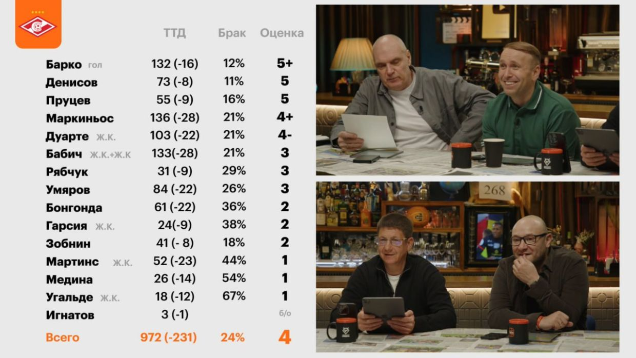 Экс-футболист оценил выступления игроков по пятибалльной системе на основе технико-тактических действий. «Спартак» получил от эксперта оценку «четыре». У красно-белых было 972 (-231) технико-тактических действия. Процент брака составил 24%.