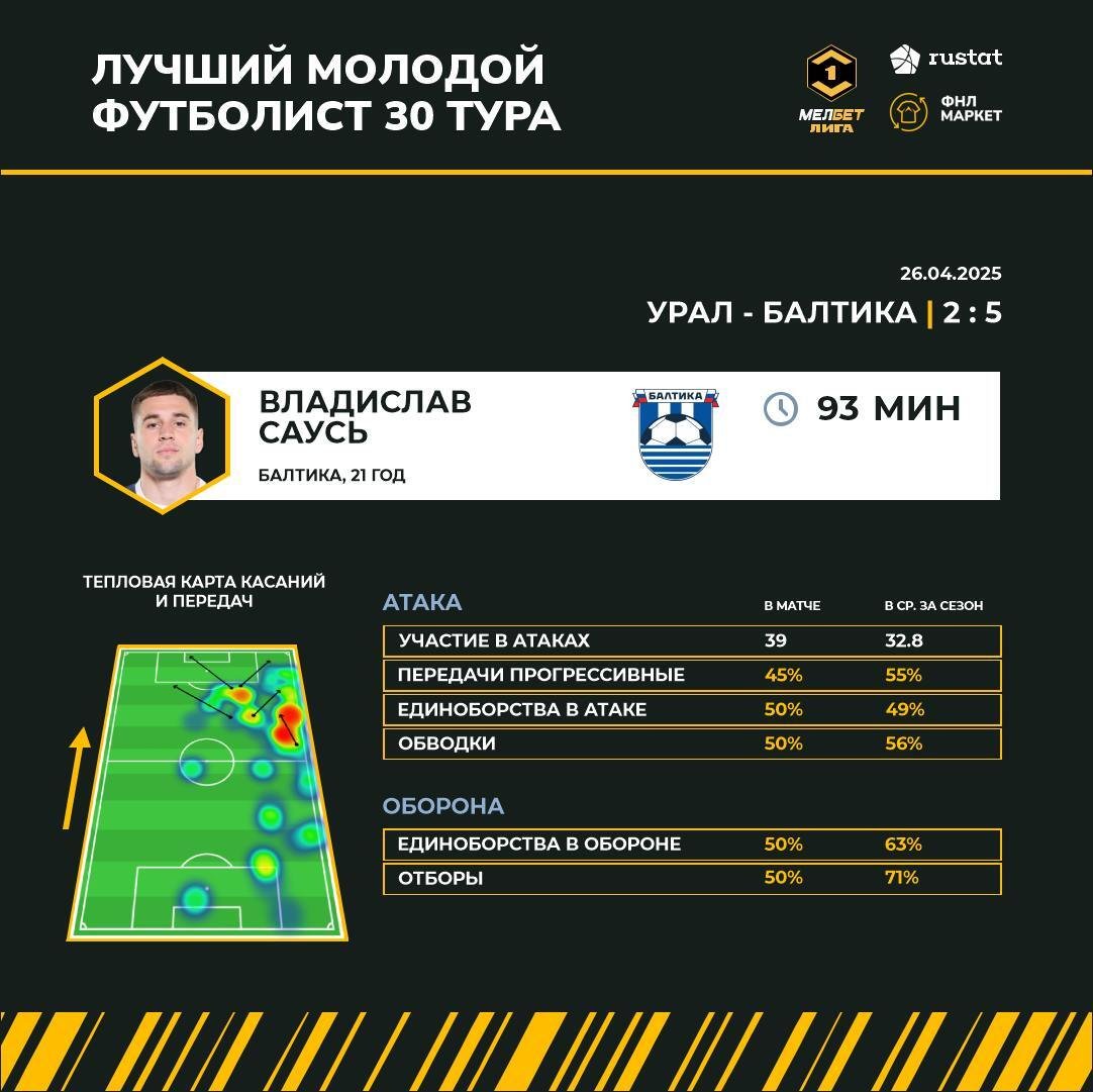 Полузащитник калининградской «Балтики» Владислав Саусь стал лучшим молодым футболистом 30-го тура Мелбет-Первой лиги. Об этом сообщил телеграм-канал «ФНЛ Маркет».
