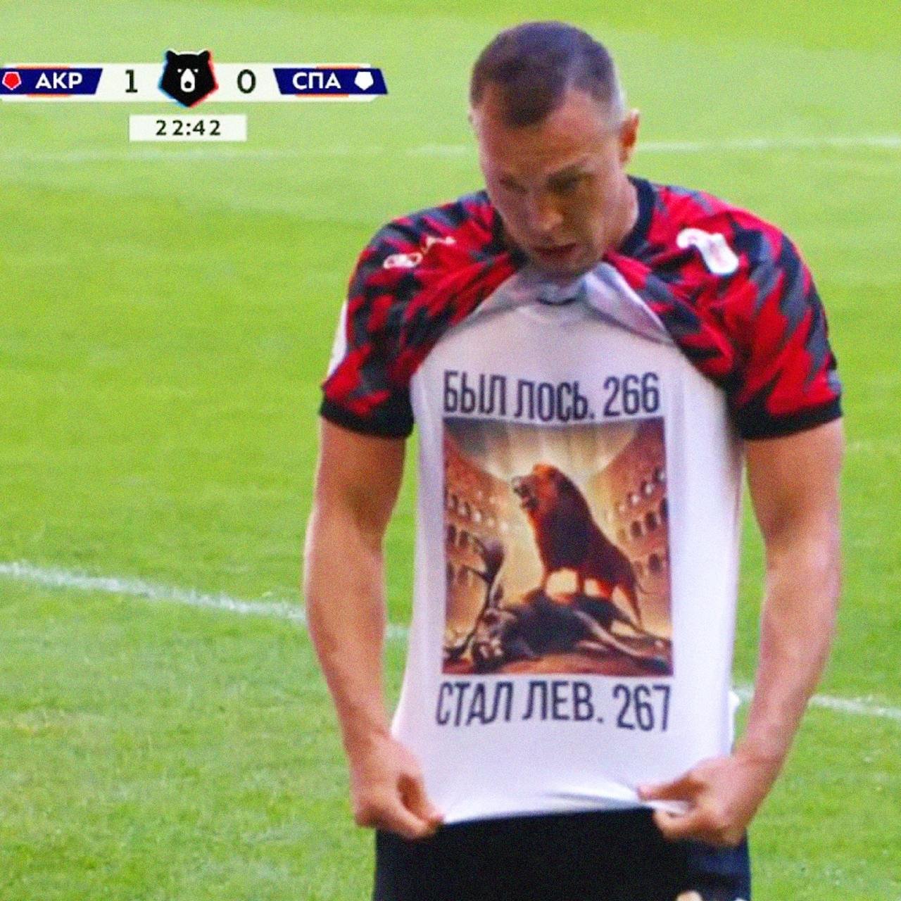 Форвард отличился на 23-й минуте игры, реализовав пенальти, который сам и заработал. После этого Дзюба поднял игровую футболку, продемонстрировав майку с надписью «Был лось. 266. Стал лев. 267» и изображением льва, стоящего на туше лося. Это изображение отсылает к количеству результативных действий 36-летнего форварда в чемпионате России.