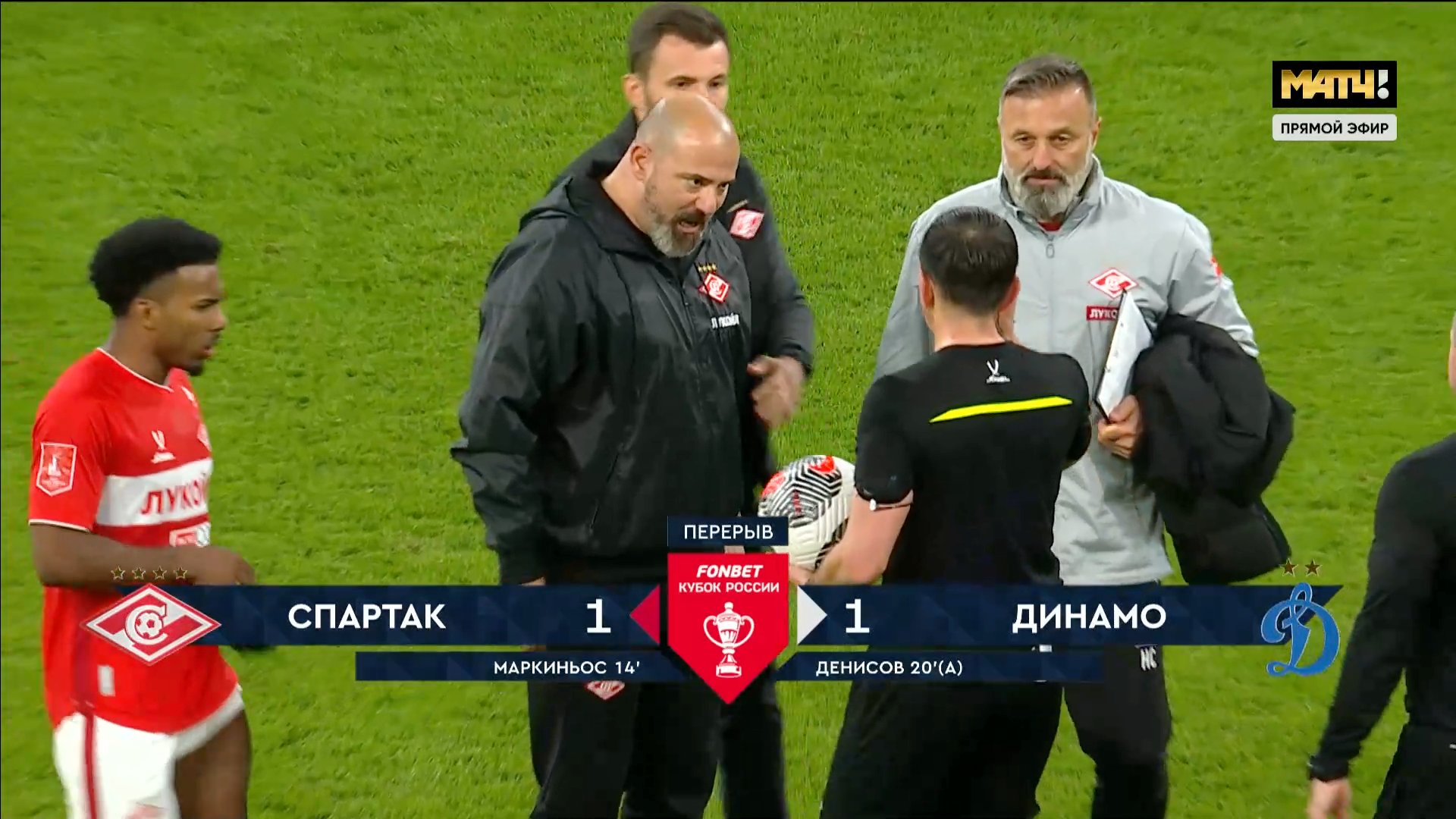 Главный тренер «Спартака» Деян Станкович и его помощники выбежали на поле после первого тайма 1/2 финала Пути регионов Фонбет Кубка России с московским «Динамо».