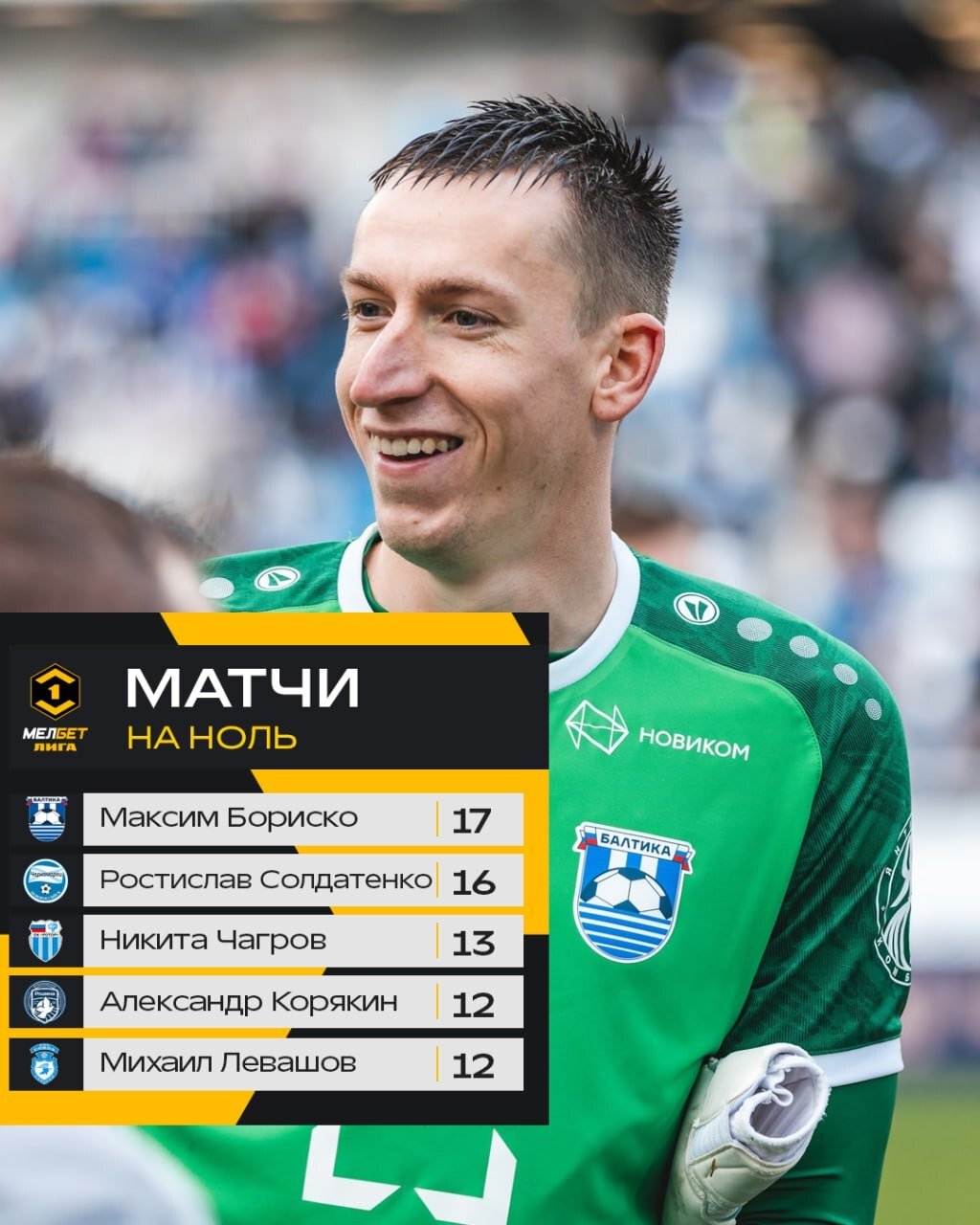 При этом больше всего сухих матчей отыграл вратарь калининградской «Балтики» Максим Бориско (17).