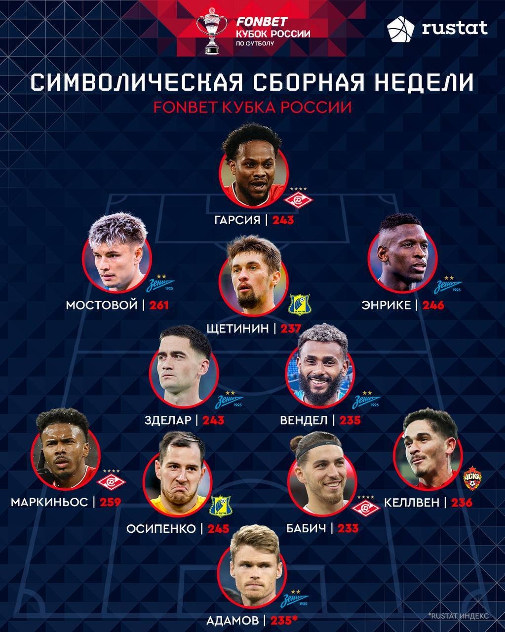 Пресс-служба Фонбет Кубка России представила символическую сборную по итогам прошедших на неделе матчей на основе статистических данных РУСТАТ.