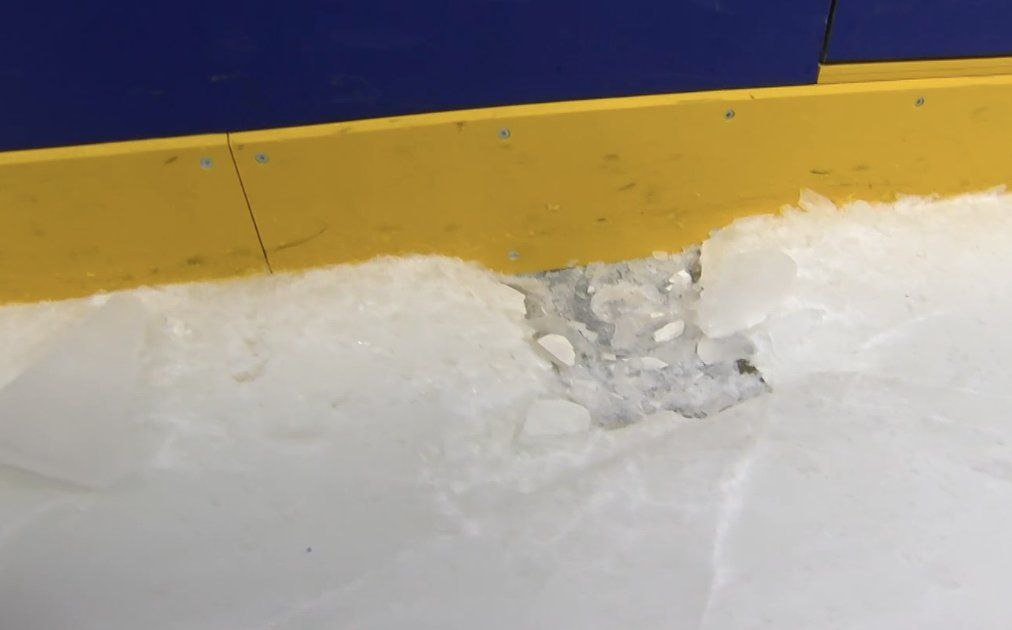 За три с половиной минуты до конца периода матч был остановлен. У борта образовалась огромная яма, кусок льда оказался отколот. Арбитры матча приняли решение не доигрывать первый период и отпустить команды в раздевалки. Оставшееся время сборные доиграют во втором периоде.