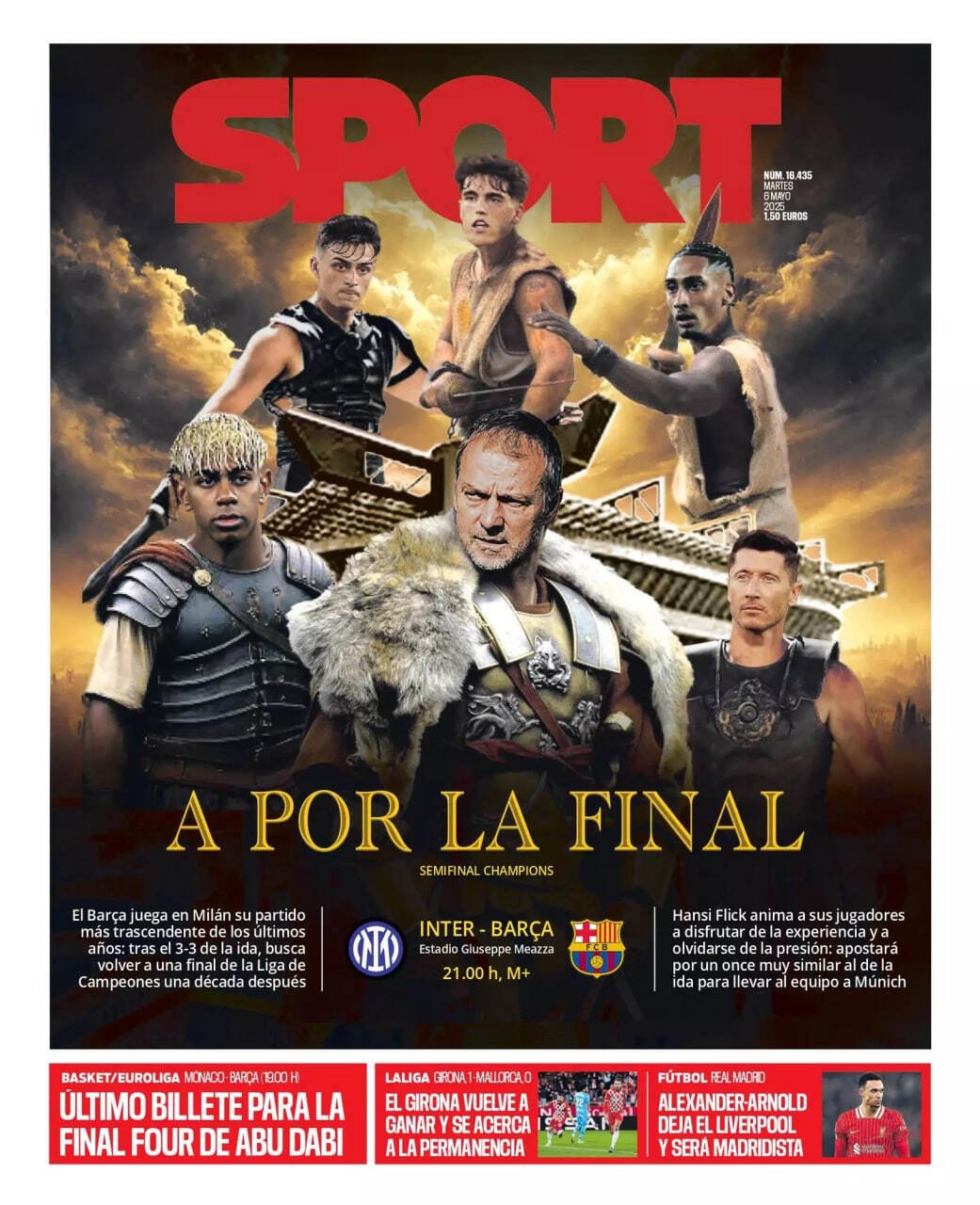 Ханс-Дитер Флик, Роберт Левандовски, Ламин Ямаль, Рафинья, Пау Кубарси и Педри с помощью фотошопа представлены героями «Гладиатора». Обложка посвящена предстоящему ответному матчу «Барсы» с «Интером» в полуфинале Лиги чемпионов.