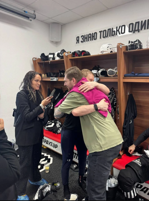 Воспитанник «Трактора» обнялся с форвардом Василием Глотовым, которого в декабре обменяли из СКА в челябинский клуб.