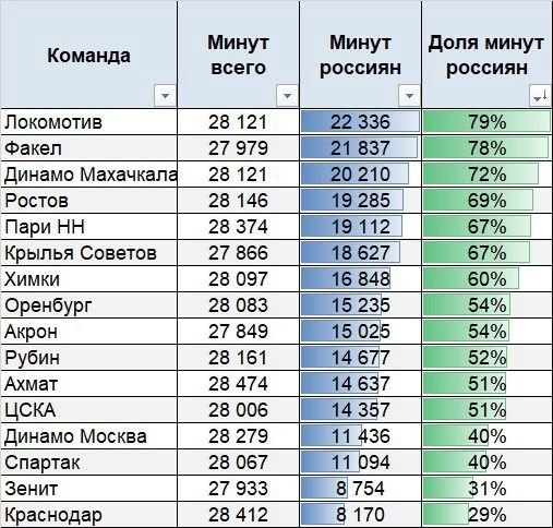 Разрыв между лидером и «Краснодаром», занимающим последнее место в этом аспекте, значителен: если у «Локомотива» россияне провели на поле 79 процентов всех минут, то «Краснодар» — единственная команда, у которой этот показатель составил менее 30.