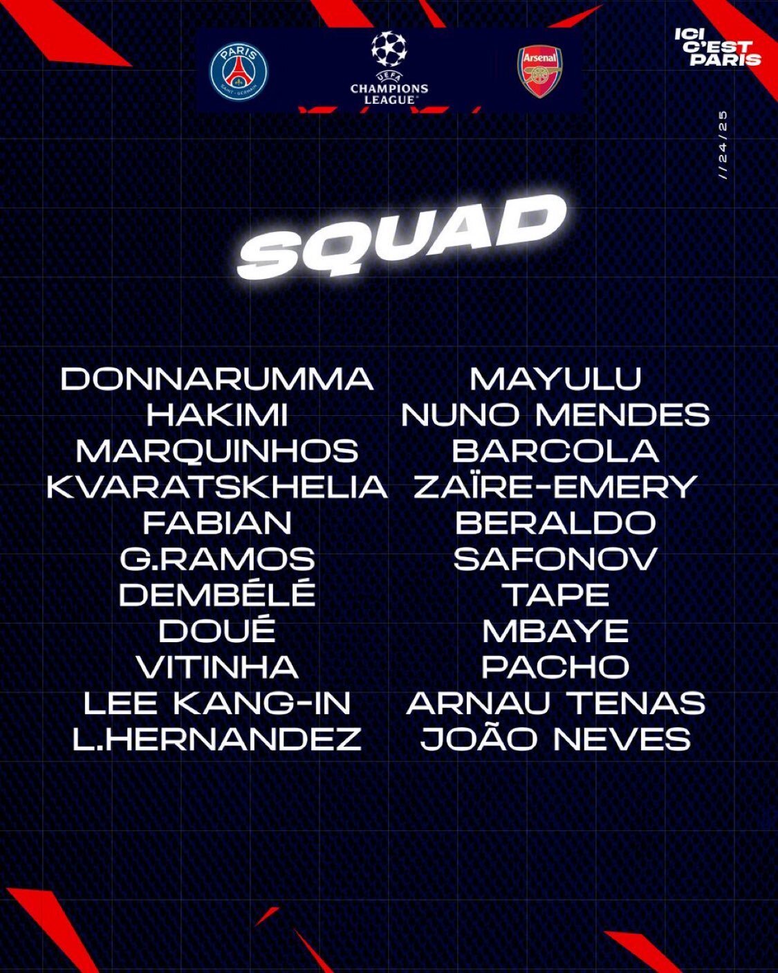 Пресс-служба «ПСЖ» опубликовала заявку на предстоящий ответный полуфинальный матч Лиги чемпионов против «Арсенала».
