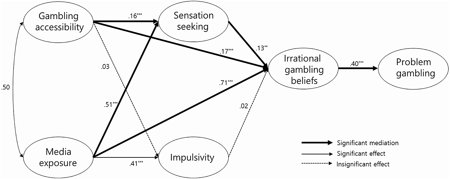 На жажду острых ощущений и иррациональные представления об азартных играх сильнее всего влияют доступность гемблинга и проникновение медиа. Схема «проникновение медиа → иррациональные представления об азартных играх → проблемный гемблинг» получила наибольший коэффициент среди всех (0,14).