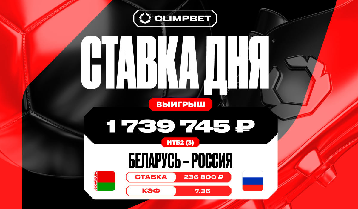 Один из клиентов OLIMPBET оформил смелую ставку на голы россиян в этом матче. Победа команды Карпина оценивалась коэффициентом 1.75, а беттор решил взять Индивидуальный тотал сборной России (3) больше. На этот исход клиент букмекера определил 236 800 рублей, задействовав коэффициент 7.35. В начале второго тайма, когда Гладышев забил свой четвертый матч, ставка сыграла — итоговый выигрыш составил 1 739 745 рублей.