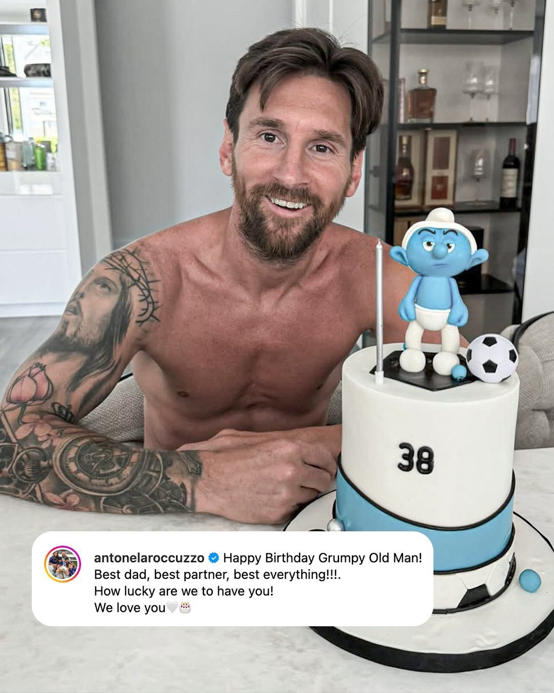 Сегодня, 24 июня, известному аргентинскому футболисту Лионелю Месси исполнилось 38 лет. Жена игрока Антонелла Рокуццо подарила своему мужу оригинальный торт в виде смурфика, выполненный в бело-голубых цветах, как и форма сборной Аргентины.