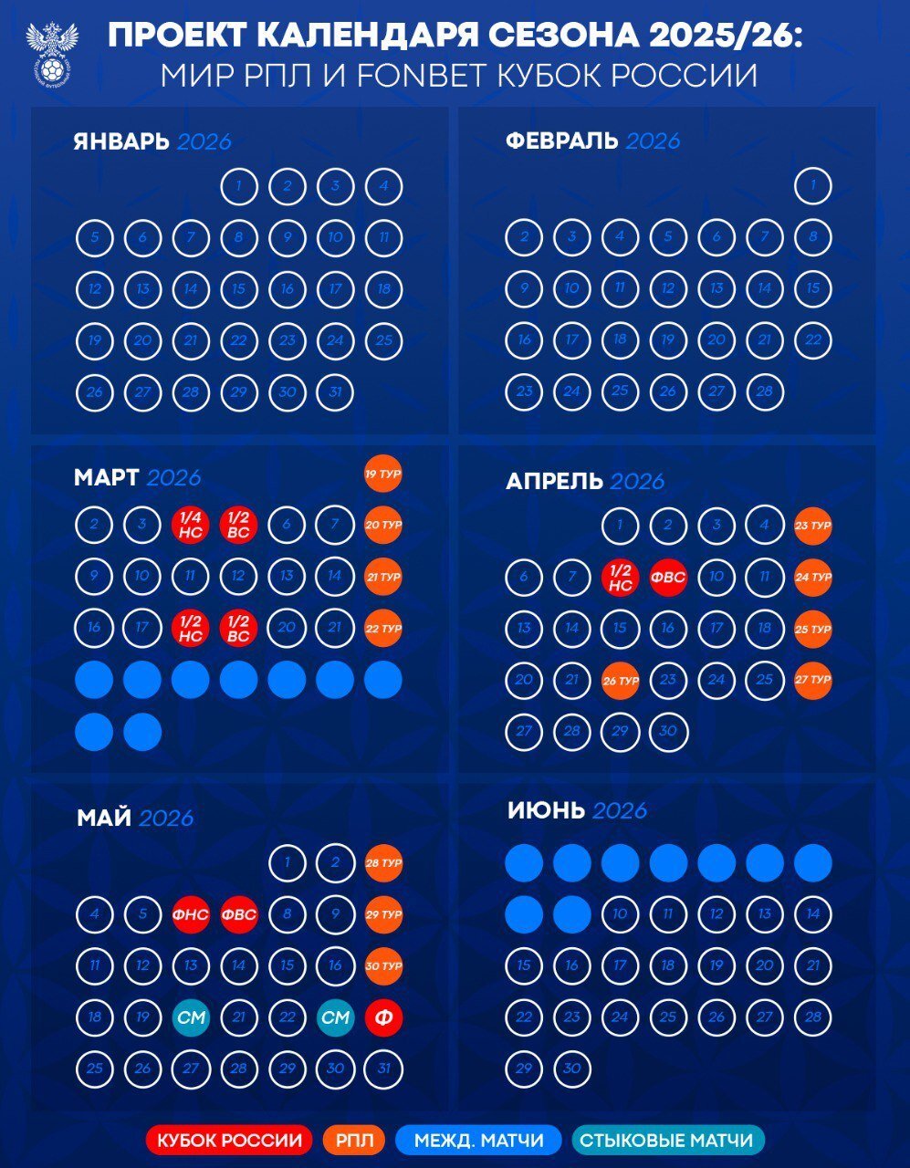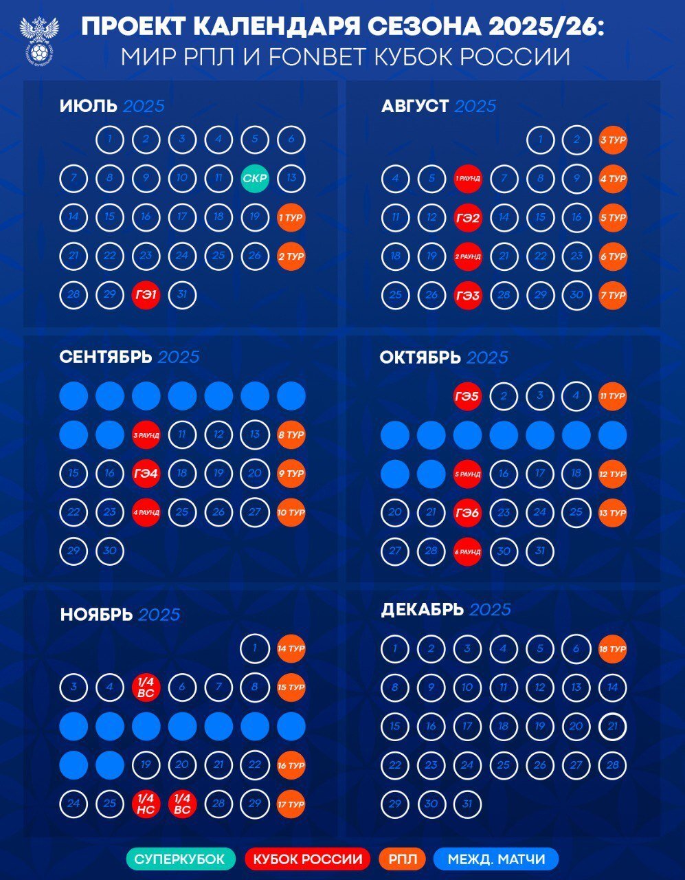 РФС утвердил график календаря на сезон-2025/26 — известно, когда пройдут матчи РПЛ и Кубка России