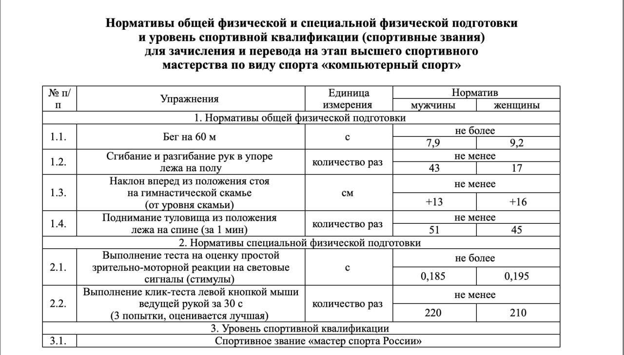 Чтобы стать обладателем мужского звания «высшего спортивного мастерства в «компьютерном спорте» среди прочего нужно будет: