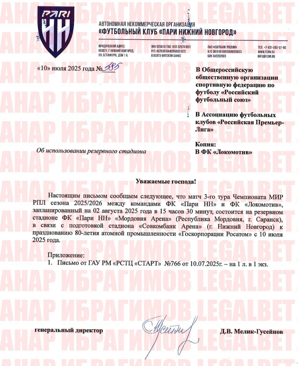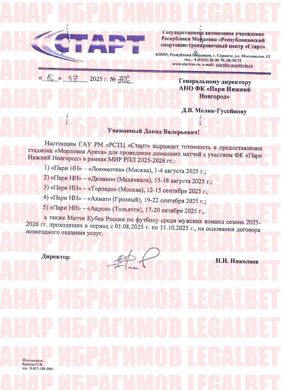 У нижегородского клуба есть договорённость о проведении игр на «Мордовия Арене» до конца октября. Также команда сможет играть в Саранске матчи Фонбет Кубка России до 31 октября.