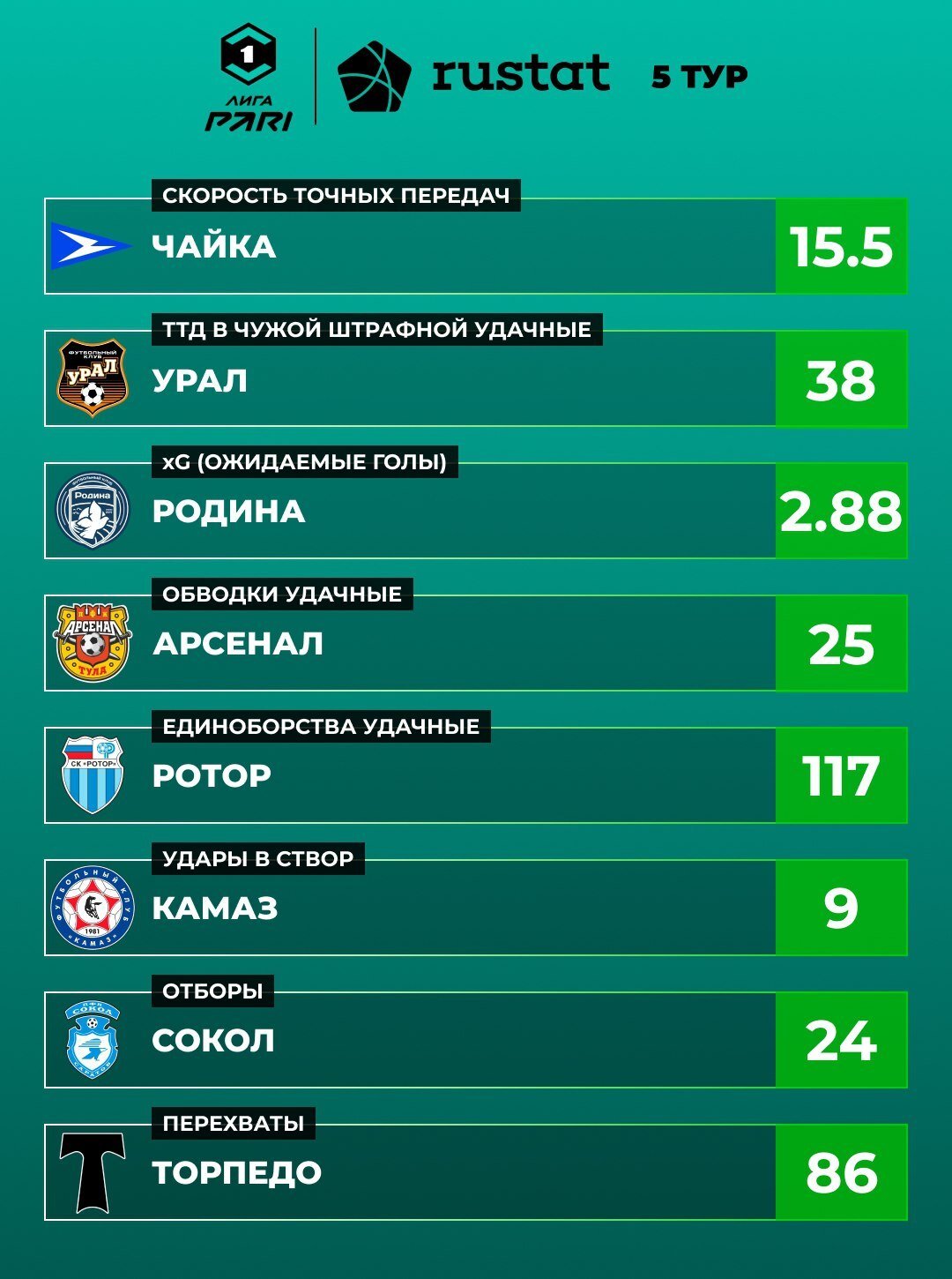 - После пяти туров в турнирной таблице лидирует воронежский «Факел» (15 очков), второй — екатеринбургский «Урал» (12 очков), третий — челнинский «КАМАЗ» (10).