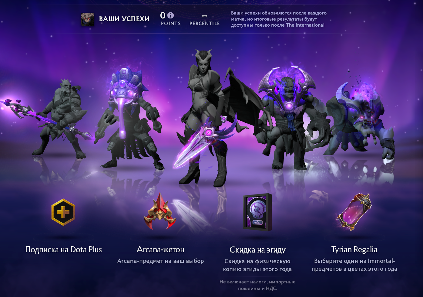- 1,5 тыс. лучших: бесплатная подписка Dota Plus на полгода, жетон на бесплатный предмет Arcana, скидка 100% на Аегис и две Immortal-сокровищницы Tyrian Regalia;