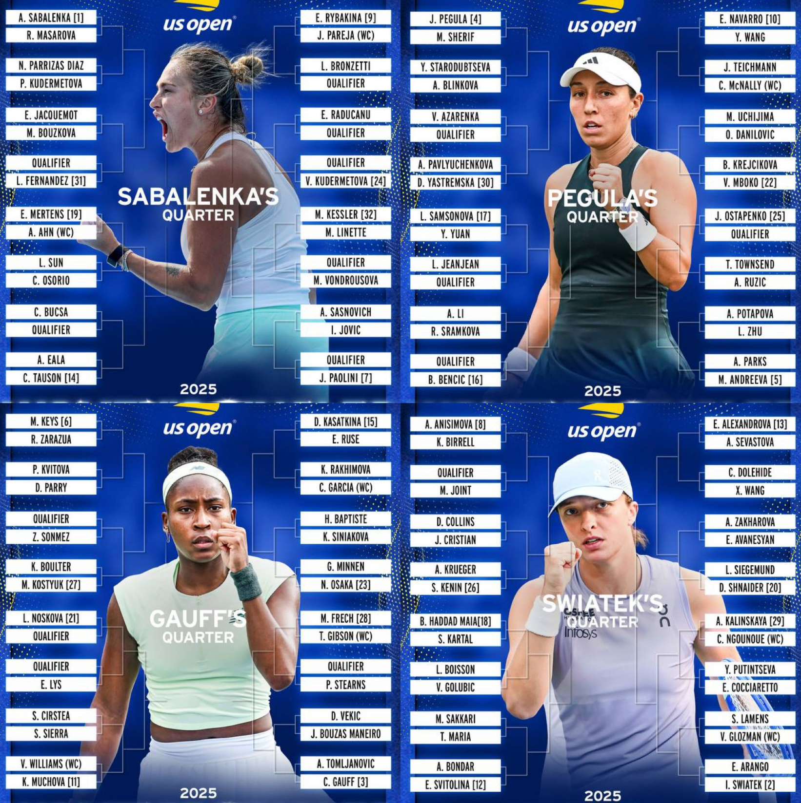 Мирра Андреева начнёт турнир игрой против американки Алисии Паркс. Анастасия Павлюченкова сыграет с украинкой Даяной Ястремской. Диане Шнайдер предстоит игра против немки Лауры Зигемунд, а Екатерина Александрова встретится с Анастасией Севастовой из Латвии.