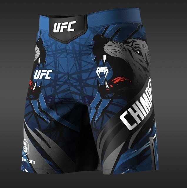 Непобеждённый российский боец UFC Хамзат Чимаев, представляющий ОАЭ, получил кастомные шорты для титульного боя против Дрикуса Дю Плесси. На экипировку по бокам нанесли изображение в виде волчьих голов, в одну из которых вписана фамилия спортсмена.