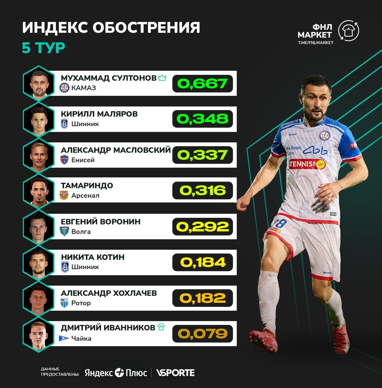 Футбольная национальная лига (ФНЛ) опубликовала рейтинг игроков Лиги PARI по индексу обострения после пятого тура.