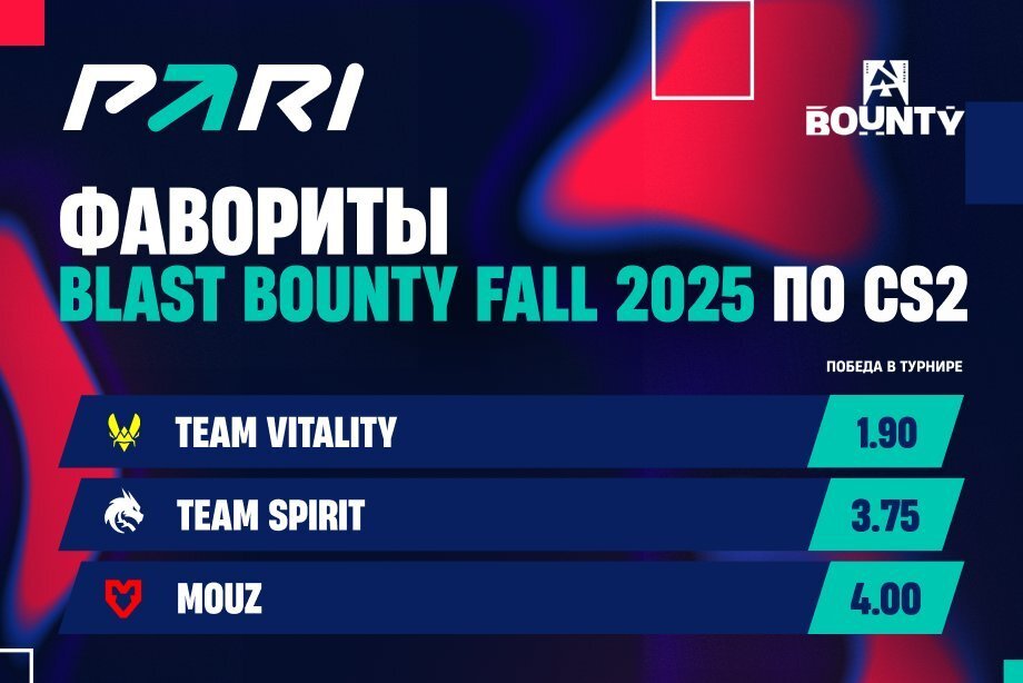 14 августа стартует чемпионат BLAST Bounty Fall 2025 по Counter-Strike 2. На ивенте выступят восемь коллективов. Букмекерская компания PARI открыла линию на фаворитов турнира. По оценкам аналитиков, главным претендентом на трофей будет Team Vitality.