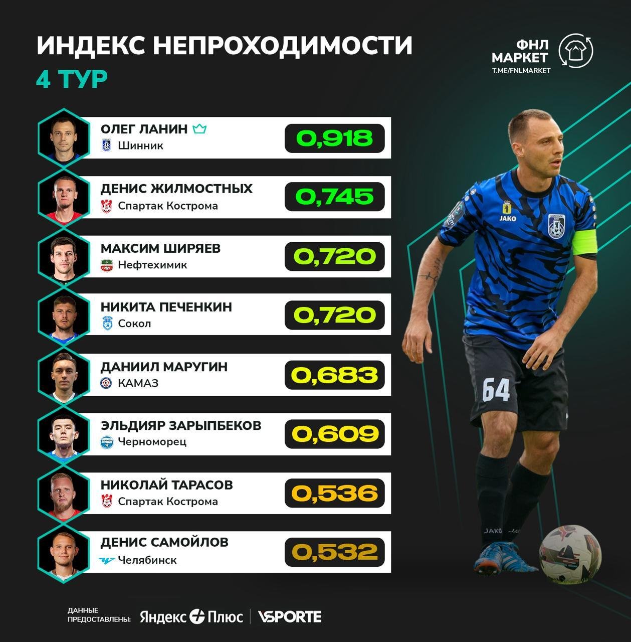 Полузащитник ярославского «Шинника» Олег Ланин возглавил в рейтинг лучших игроков 4-го тура Лиги PARI по индексу непроходимости.