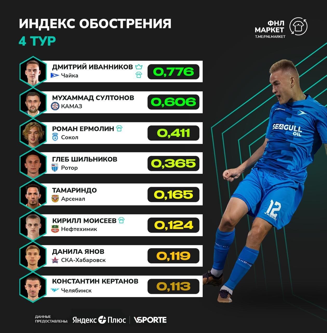 Футбольная национальная лига (ФНЛ) опубликовала рейтинг игроков Лиги PARI по индексу обострения после 4-го тура.